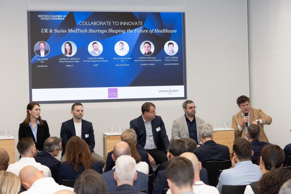 The first panel looked at how UK and Swiss startups are moving from lab results to patient impact. Moderated by Phil Norris (machineMD), it featured Clémence Hermann (Spirecut), Christian Mirkes (SKOPE MRI), Matt Curran (Nanoflex Robotics), Nicolas Bouduban (Swiss m4m Center), and Martin Hofmann (University of Bern).